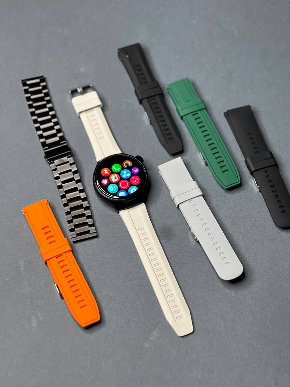 بندها: 7 بند مختلف (سیلیکونی مشکی، سفید، طوسی، سبز، نارنجی + بند فلزی استیل لوکس) قابل تعویض سریع