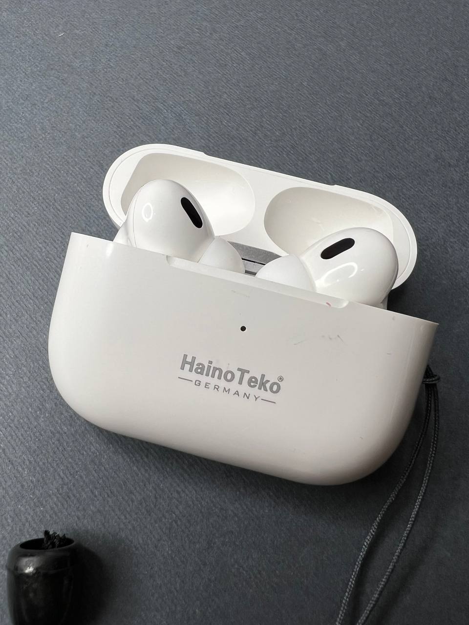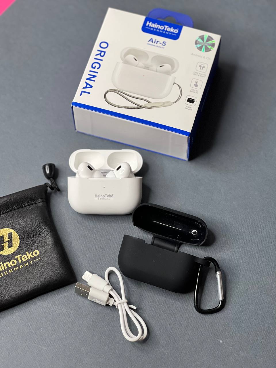 ایرپاد Haino Teko مدل Air5 یک هندزفری بی‌سیم حرفه‌ای با طراحی مشابه ایرپاد پرو ۲ است. این محصول دارای صدایی با کیفیت عالی، بیس مناسب، اتصال سریع بلوتوث و طراحی ارگونومیک برای استفاده طولانی‌مدت می‌باشد. همراه این ایرپاد، یک کیس سیلیکونی برای محافظت و یک کیف چرمی شیک با بند آویز عرضه می‌شود تا حمل آن راحت‌تر باشد. مناسب برای گوشی‌های آیفون، اندروید و همه کاربرانی که به دنبال کیفیت و زیبایی در کنار قیمت مناسب هستند.باکس این هندزفری علاوه بر محافظت از گوشی‌ها، وظیفه شارژ کردن آن‌ها را بر عهده دارد. باتری باکس این هندزفری با یک بار شارژ کامل می‌تواند حدود 3 بار گوشی‌ها را شارژ کند و با یک بار شارژ گوشی‌ها شما می‌توانید حدود 4 ساعت موسیقی گوش دهید و مکالمه کنید. یعنی با یک بار شارژ باکس می‌توانید حدود 10 تا 14 ساعت از گوشی‌ها استفاده کنید. البته همه این تخمین‌ها بسته به حجم صدایی دارد که با آن موسیقی گوش می‌کنید. کنترل موسیقی در حال پخش، مدیریت تماس و … از ویژگی‌های لمسی این مدل است؛ مثلا با دو بار لمس، موسیقی را قطع یا وصل می‌کند و سه بار لمس آهنگ را عوض می‌کند. یک نکته مثبت دیگر این است که هر کدام از گوشی‌ها مستقیم به موبایل وصل شده و میکروفن جداگانه دارند که در نتیجه می‌توانید گاهی اوقات در صورت نیاز از یکی از گوشی‌ها استفاده کنید. با استفاده از این هندزفری می‌توانید تا فاصله حدودا ده متری بدون افت کیفیت، صدا را بشنوید و از موسیقی و مکالمه لذت ببرید.