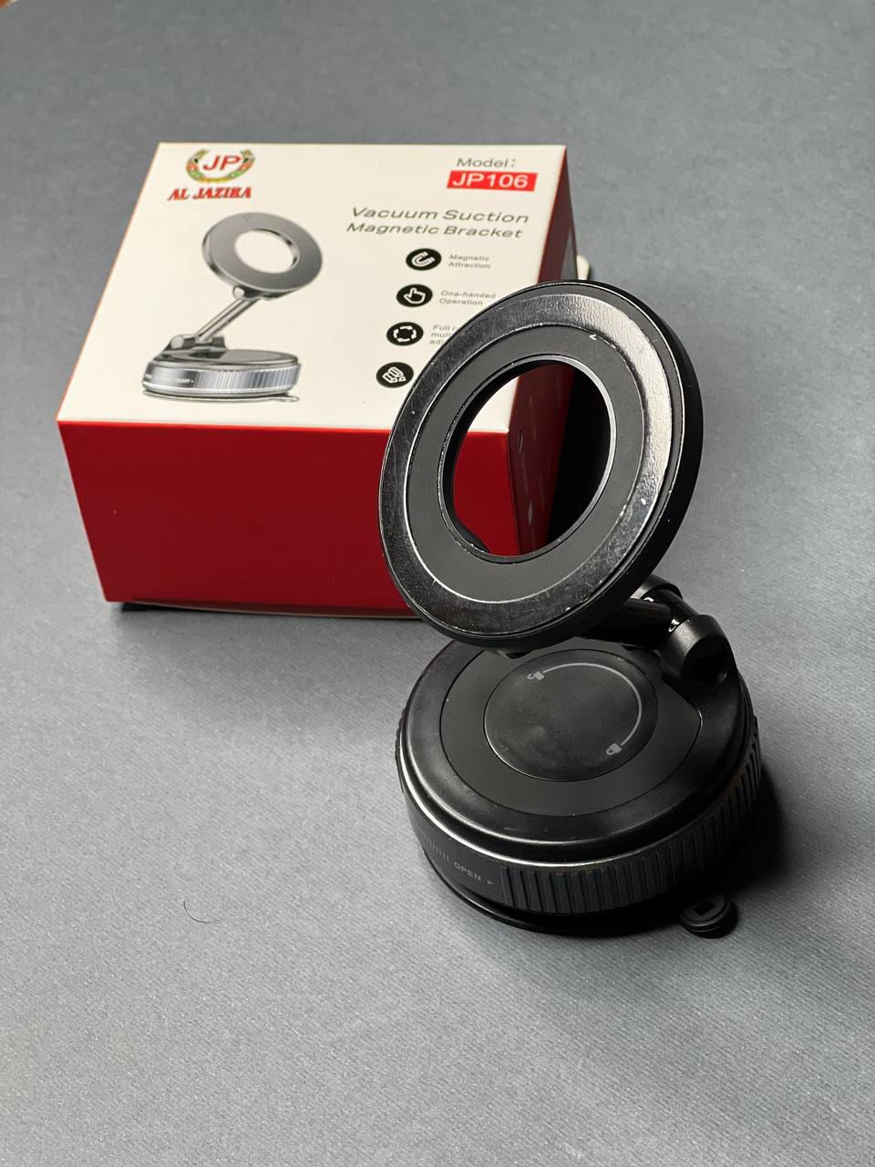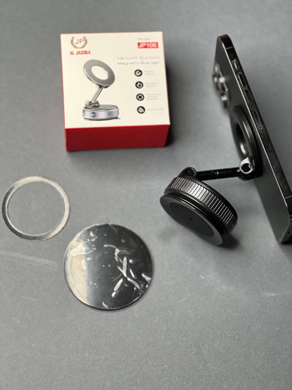 هولدر مکسیفی چرخشی وکیوم دار JP106 یک پایه نگهدارنده چندمنظوره است که از سیستم مکش خلأ و آهن‌ربای قوی داخلی استفاده می‌کند تا وسایل مختلف به‌ویژه موبایل یا دوربین‌های سبک را روی سطوح صاف به‌صورت محکم نگه دارد.